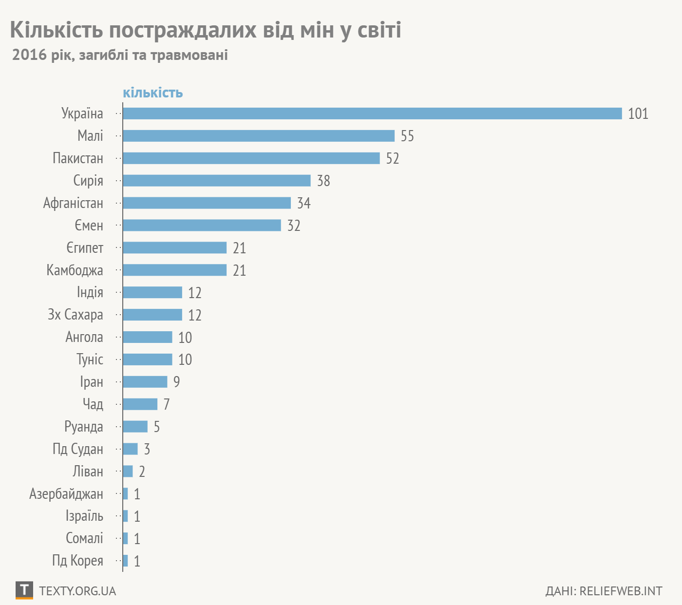 May. 5th, 2017 10:19 amВ Україні два роки поспіль найбільше у світі людей постраждали, підірвавшись на мінах. У 2016 році постраждала 101 людина: 43 загинули та 58 травмовані. Це значно більше, ніж будь-де у світі.